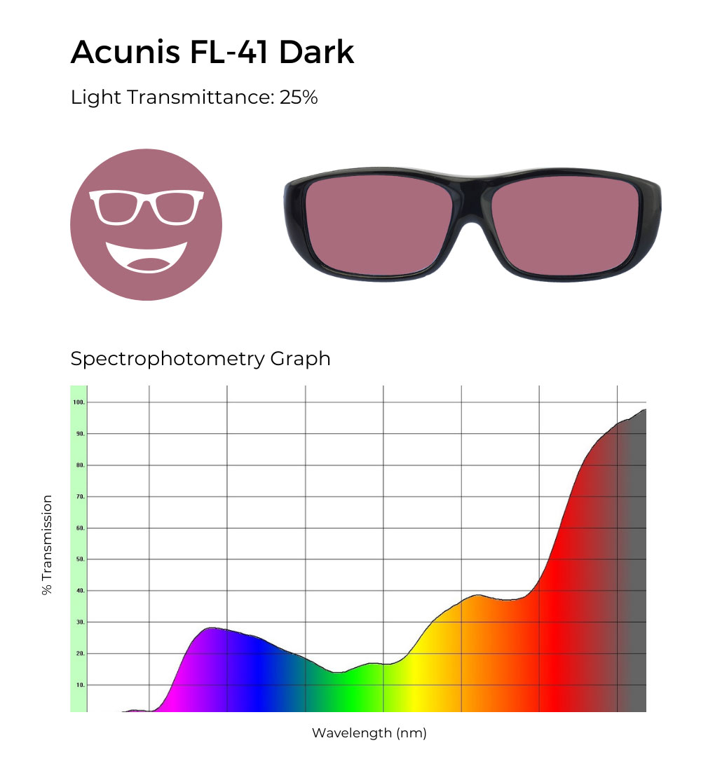 Acunis FL-41 Dark filters are designed to protect against unpleasant glare and assist those with light sensitivity due to migraines, traumatic brain injury, and other eye conditions. Acute light sensitivity is a common side effect of these conditions and can worsen symptoms.