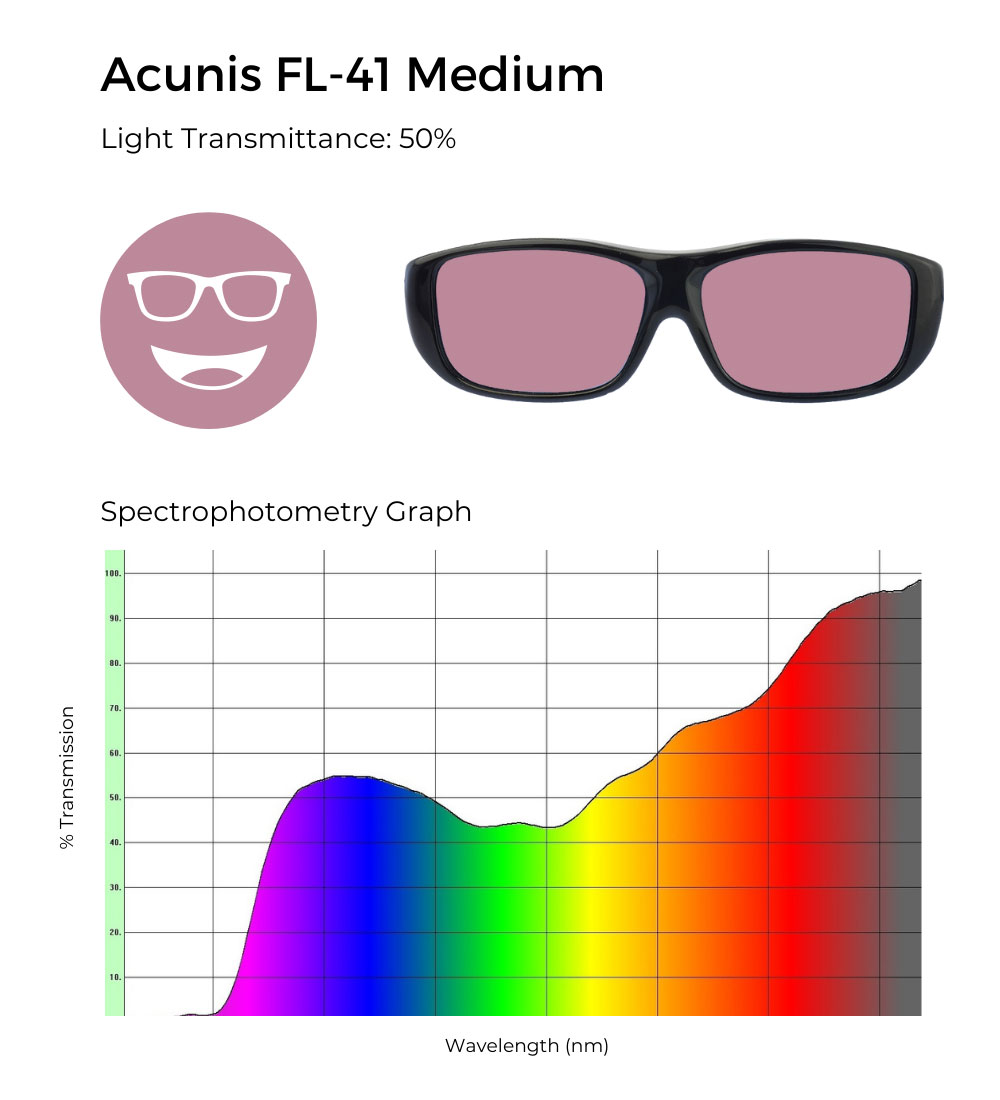 Acunis FL-41 Medium filters are designed to protect against unpleasant glare and assist those with light sensitivity due to migraines, traumatic brain injury, and other eye conditions. Acute light sensitivity is a common side effect of these conditions and can worsen symptoms.